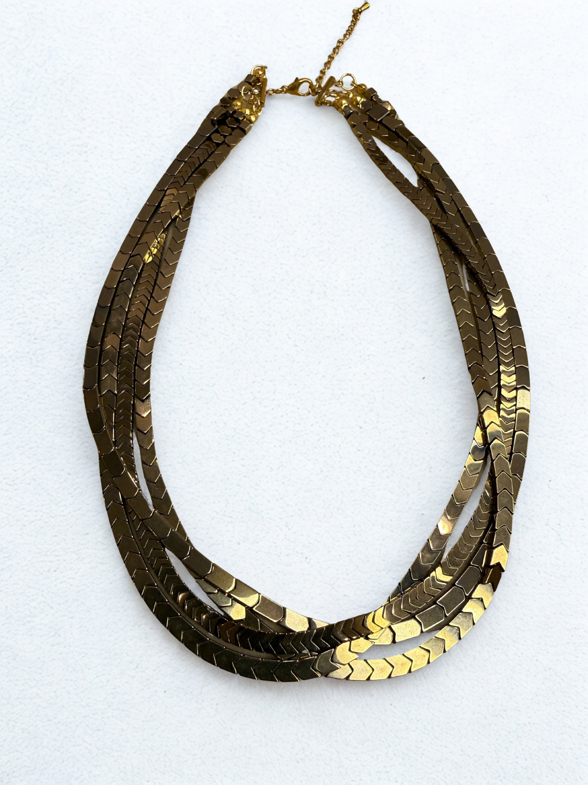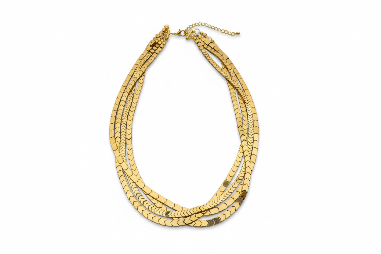 Keturių juostų vėrinys iš aukso atspalvio hematito, išsiskiriantis sodriu blizgesiu ir tekančia forma. Daugiasluoksnė struktūra suteikia apimties ir kuria stiprų, bet elegantišką akcentą. Tai išraiškingas papuošalas moteriai, kuri vertina prabangą be pertekliaus ir pasitikėjimą savimi.
