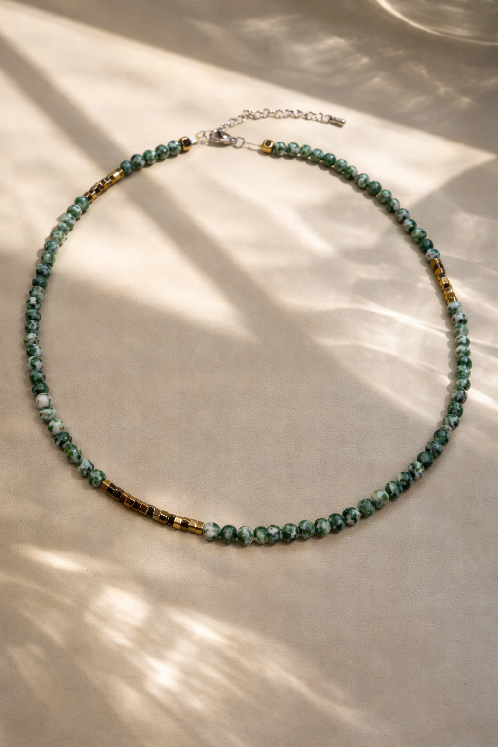 Vėrinys iš natūralaus žalio jaspio karoliukų, papildytas hematito akmens intarpais. Jaspis suteikia natūralų, žemišką charakterį, hematitas – subtilų blizgesį ir struktūrą. Minimalistinis, lengvas, aiškios formos. Gerai atrodo vienas ir sluoksniuojant su kitais vėriniais. Tinkamas kasdieniam nešiojimui.