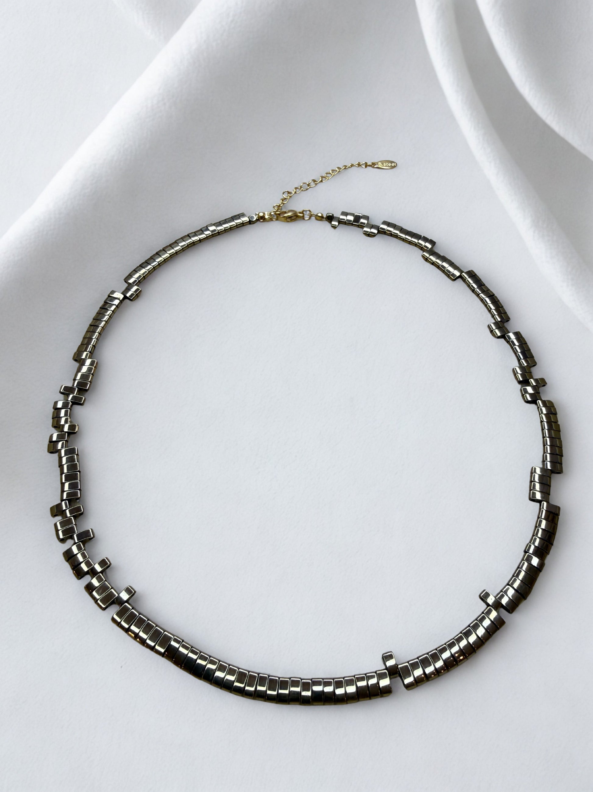 Minimalistinis vėrinys iš natūralaus hematito, išsiskiriantis subtiliu aukso blizgesiu ir ritmiška forma. Hematitas siejamas su stabilumu ir vidine ramybe, todėl tai lengvai derinamas, kasdieniam įvaizdžiui tinkantis papuošalas.